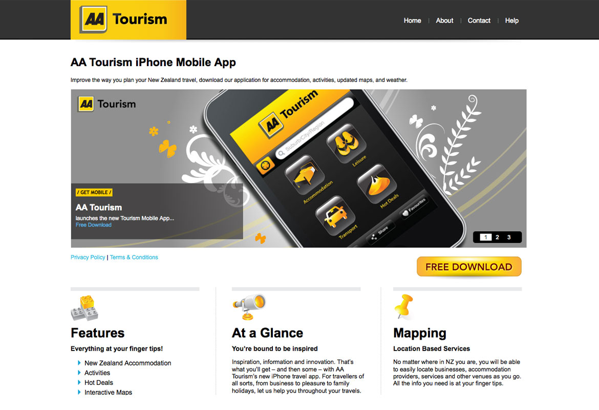 AA Mobile App - icon design and screen concepts. The mobile application includes the ability to book accommodation online via the AAT reservation engine. Categories include: Accommodation, Leisure, Conferences and Hot Deal promotions. The application allows the user to select from their current location via GPS, or enter any other New Zealand location to use as a basis for searches.
