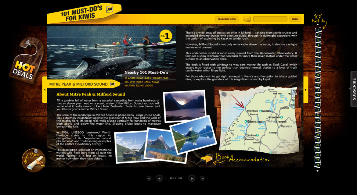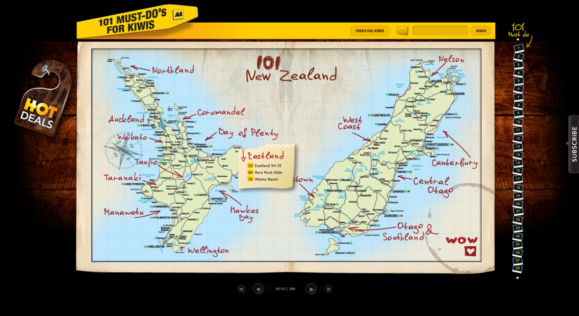 Pushing the boundaries of the eBook Template I had fun designing the 101 Must-Do's. The technology ultilised Flash so I created some custom Action Script to work in with the 101 PDF pages. The Interactive Map had drop down menus with drill downs from each of the main cities. There was a scrolling side navigation to quick link you to the 101 pages advertising each of the top NZ Must Do's. On top of this there was additional little cute animations like the hot deals tag swung on hover and the subscribe form would pop out.