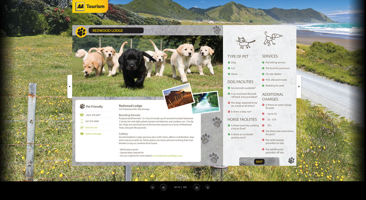 I also designed the look of the Pet Friendly pages, to contrast with the woody background of the 101's I used a concrete look and feel with footprints to boot.