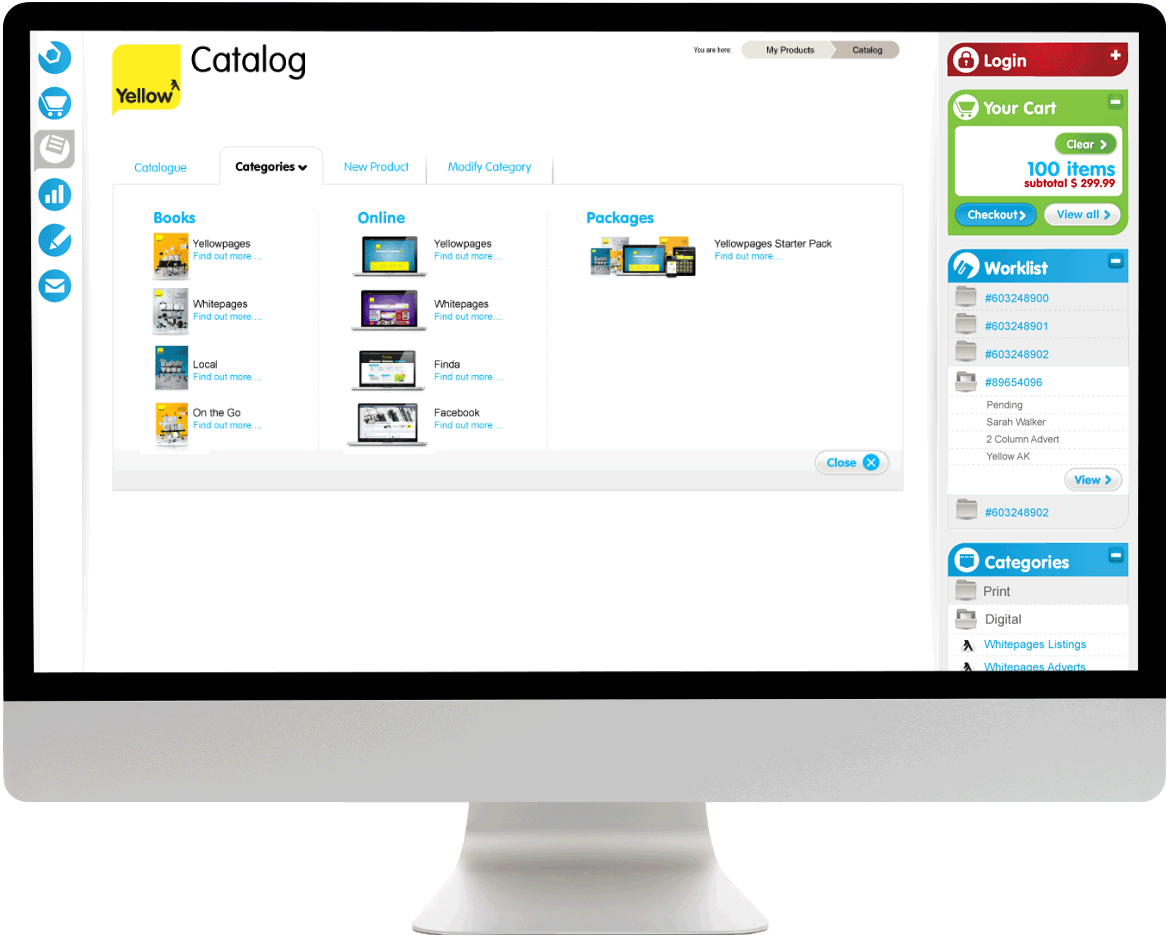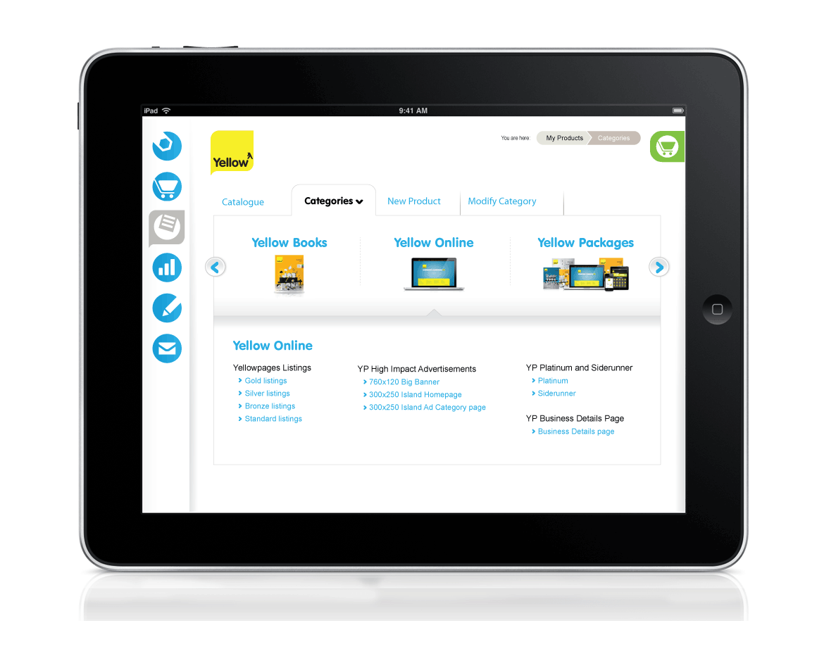 Designed to revolutionalise the way Yellow would sell and maintain listings on both their books and various online sites. One manatory requirement was that the application worked on an i-Pad. The Yellow mobile sales rep would visit clients and create listings on the fly using their i-Pad whilst generating valid quotes.