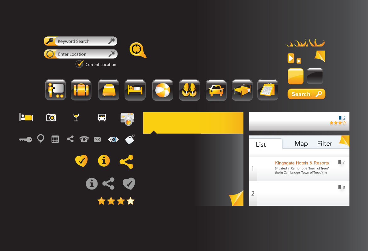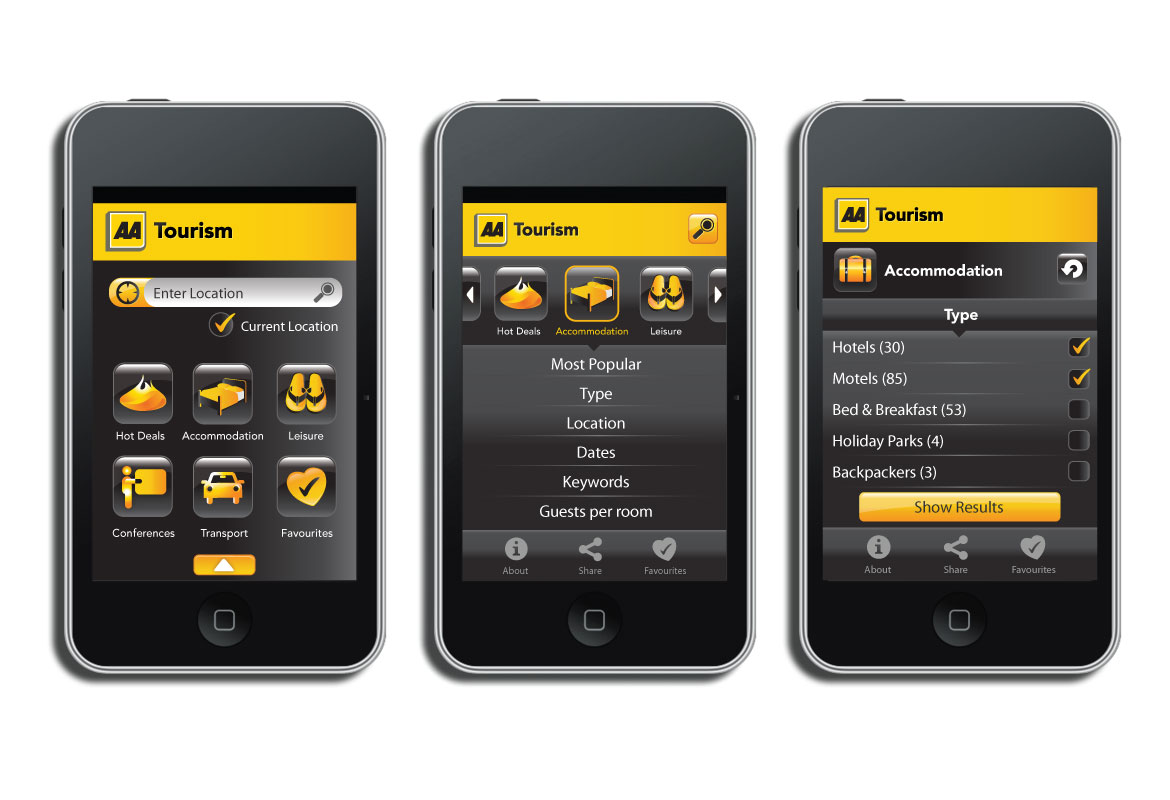 AA Mobile App - icon design and screen concepts. The mobile application includes the ability to book accommodation online via the AAT reservation engine. Categories include: Accommodation, Leisure, Conferences and Hot Deal promotions. The application allows the user to select from their current location via GPS, or enter any other New Zealand location to use as a basis for searches.