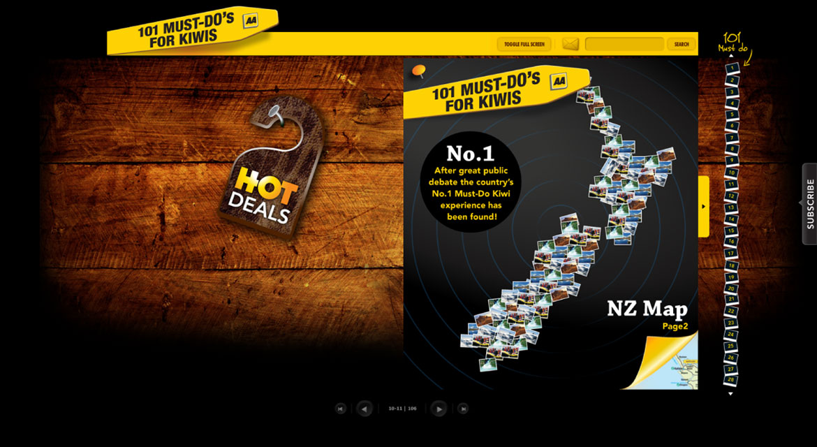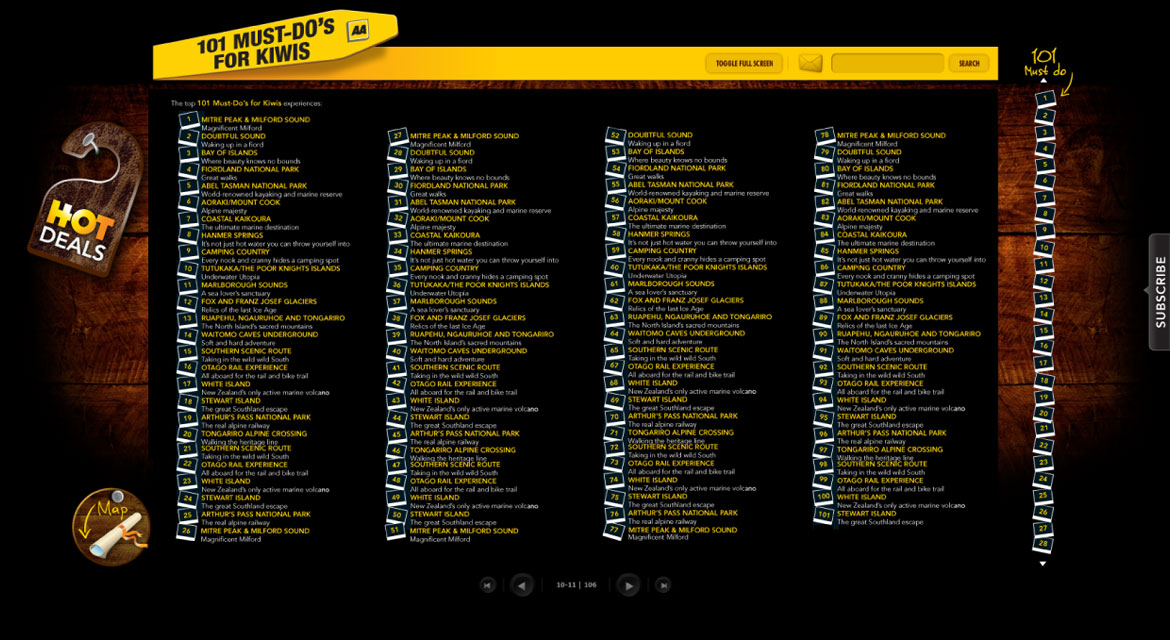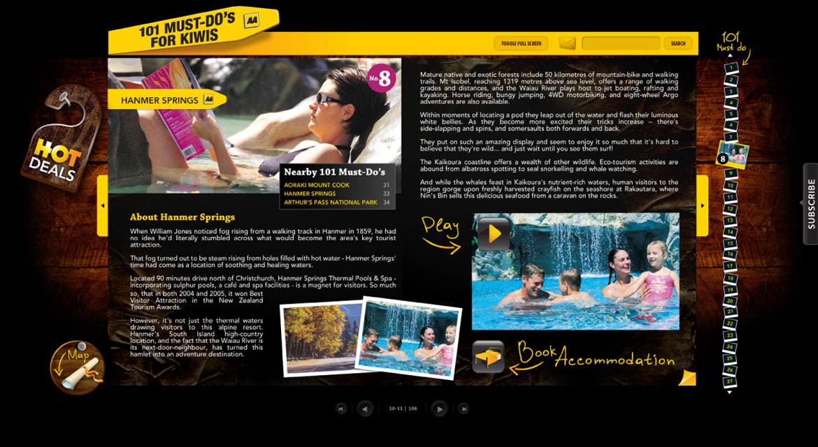 Pushing the boundaries of the eBook Template I had fun designing the 101 Must-Do's. The technology ultilised Flash so I created some custom Action Script to work in with the 101 PDF pages. The Interactive Map had drop down menus with drill downs from each of the main cities. There was a scrolling side navigation to quick link you to the 101 pages advertising each of the top NZ Must Do's. On top of this there was additional little cute animations like the hot deals tag swung on hover and the subscribe form would pop out.
