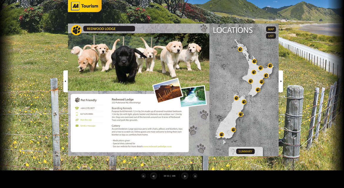 I also designed the look of the Pet Friendly pages, to contrast with the woody background of the 101's I used a concrete look and feel with footprints to boot.